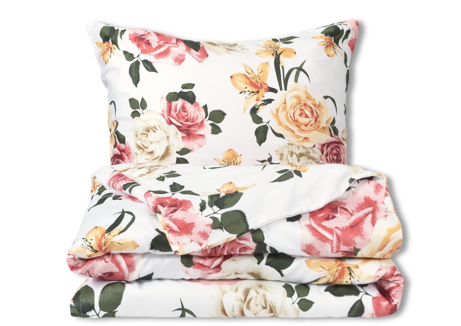 Pościel satynowa EXCLUSIVE (poszwa 220x200 cm – 1 szt., poszewki- 70x80 cm - 2 szt.) KOLEKCJA 2025 - Róże z liliami na białym tle